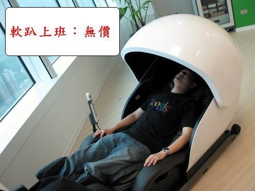 依我看來,萬事達卡那千篇一律的形象廣告真的要考慮把Google的內部陳設納入下一季的異業結盟的提案裡,蝦咪「X情無價」整個就是一個遜掉,工商社會人人都在忙著上班賺錢,日也操、暝也操,操操相連到喊操,情情愛愛沒幾個人有時間去體會它的「無價」啦!反而辦公室的設備好壞才是市井小民接觸時間最長也最感實用的福利啦!