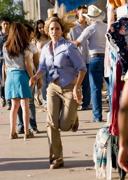 翹臀珍總是給人強勢的印象,無論是戲裡或戲外,唯一讓她居於弱勢的作品是2002年台灣未上院線的《追情殺手》,戲裡飾演一名受家暴之苦的婦女,戲外北美票房與影評皆墨,我倒認為《追情殺手》是繼《哭泣的玫瑰》後,翹臀珍洗盡鉛華、演技再度扭轉乾坤的代表作,很可惜,礙於世俗習於棒打落水狗的嗜血,那段前文所提的亂亂愛讓她演得再好都是枉然。會提到這部電影原就於在《亡命殺鎮》中有一幕翹臀珍飾演的美國記者來到華雷斯城欲報導姦殺婦女案件,當她發現倖存的受害女子搭上巴士時,於後急忙追趕巴士以便採訪這名受害女子,追逐巴士的橋段同樣出現在《追情殺手》中,不同的地方在於前者裡的她是主動緝兇的剽悍,而後者裡的她則是被動逃離施暴丈夫魔爪的極端無助,兩部電影裡她都在跑、用力地跑,有人連呼吸都有演技,翹臀珍卻用跑步跑出真感情,說來不怕見笑,她還真的是跑出我的感動以及對她的演技認同,不怕貨比貨,只怕不識貨,去租《追情殺手》的DVD來瞧瞧,就知道什麼是跑得一點都不唬爛!