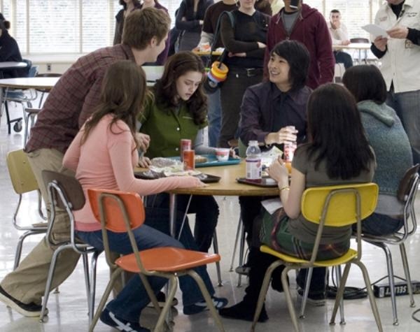 課堂上男女主角初次打照面,男方以詭異的神情不斷打量女方,女方渾身不自在地偷偷聞著自己的髮絲是否有異味﹝其實她忘記最該嗅嗅之處是 ─ ─ 腋下﹞,光看這個小動作,你就了解導演真的有導到入戲。一回生二回熟,再度於生物課時比鄰而坐,臨海的華盛頓州總是綿綿細雨,「妳喜歡下雨嗎?」男方終於打破沉默,「你在問我天氣?」女方沒好氣地反駁了男方拙劣的搭訕,就算開的不是金口,至少,友誼之手由男方來主動伸出是必然。